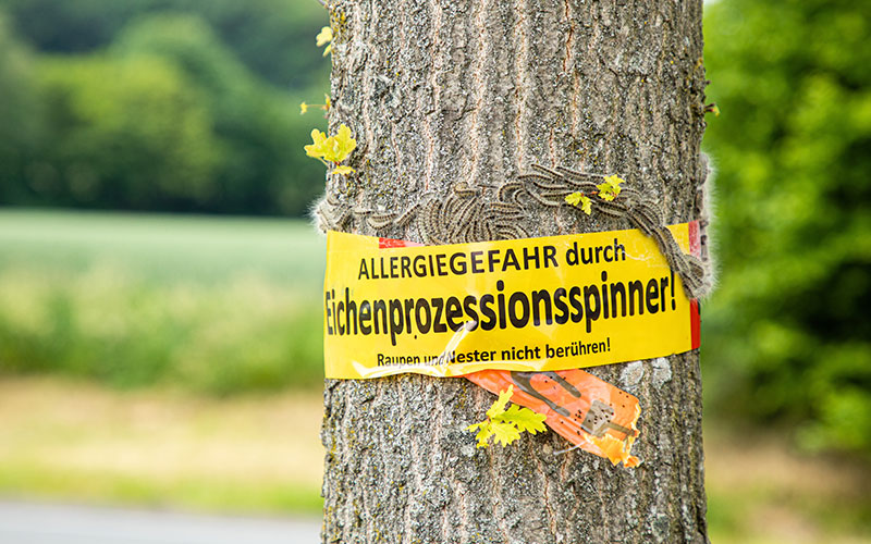 Von Mai bis Ende Juli / Anfang August ist mit einem vermehrten Auftreten des Eichenprozessionsspinners (EPS) zu rechnen. Diese nachtaktiven Raupen, ausschließlich an Eichen anzutreffen, halten sich tagsüber in Gespinstnestern am Stamm auf und begeben sich in der Dämmerung in langen Reihen zum Fressen in die Eichenkronen.