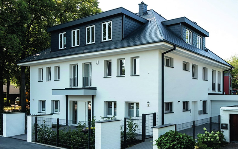„Im Rahmen eines Neubaus oder bei anstehenden Modernisierungs- oder Sanierungsarbeiten lohnt es sich daher, genauer hinzusehen und Produkte zu wählen, die den Architekturstil des Hauses betonen“, rät Andreas Palli, Geschäftsführer des Dach- und Fassadenspezialisten haushaut. Er bezeichnet zum Beispiel die Elemente der Dachentwässerung als „Hauskrawatte“. So ergänzen halbrunde Rinnen und runde Fallrohre perfekt den Look klassischer Baustile, während zu modernen Stadthäusern und eher avantgardistischen oder am Bauhausstil angelehnten Bauten quadratische Kastenrinnen und Rohre besser passen. Unter www.haushaut.de gibt es dazu mehr Informationen und Anregungen. Farblich sollten die Fassadenaccessoires ebenfalls auf den Gebäudestil abgestimmt werden. Sehr elegant sind zum Beispiel matt schimmernde Pearl-Oberflächen.