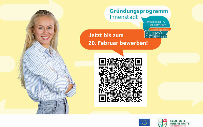 Mit ihrem neuen Gründungsprogramm Innenstadt unterstützt die Braunschweig Zukunft GmbH Gründungsvorhaben, die durch einen sozialen, kulturellen oder ökologischen Fokus die Innenstadt bereichern. Kern des Programms ist die sechsmonatige Gründungswerkstatt, bei der die Teilnehmenden neben Workshops, Mentoring und einem Pitch-Event auch von der Möglichkeit profitieren, ihre Ideen in Pop-up-Flächen und Leerständen zu testen. Das Programm ist Teil des niedersächsischen Förderprogramms „Resiliente Innenstädte“, kofinanziert durch die NBank und den Europäischen Fonds für regionale Entwicklung (EFRE).