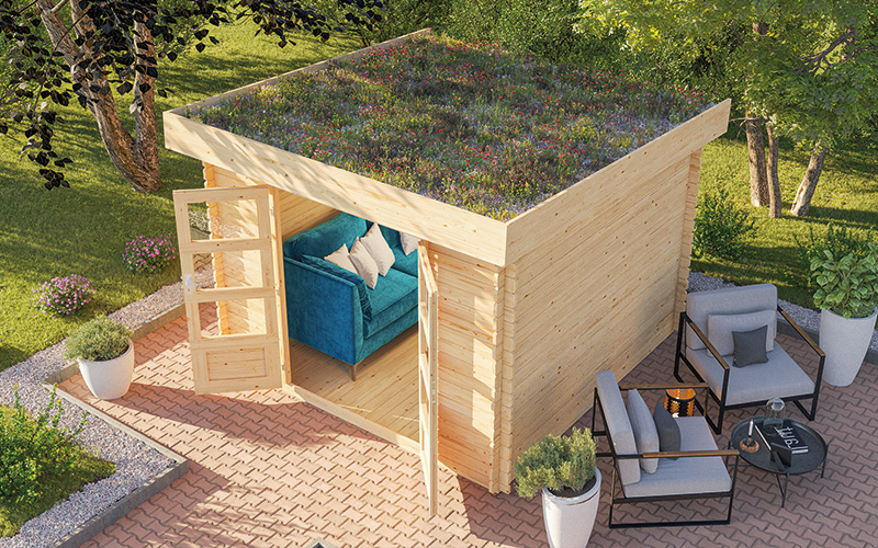 Das Gartenhaus „Flora“ von Karibu fügt sich durch seine Dachbegrünung besonders natürlich in den Garten ein.